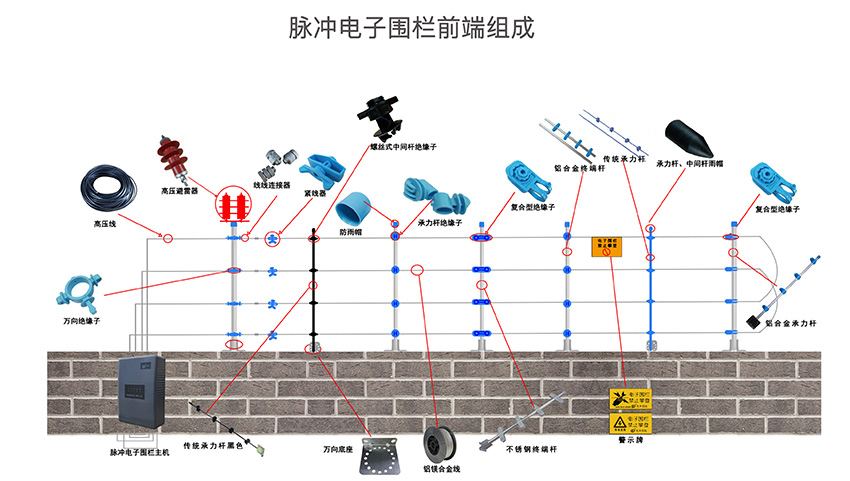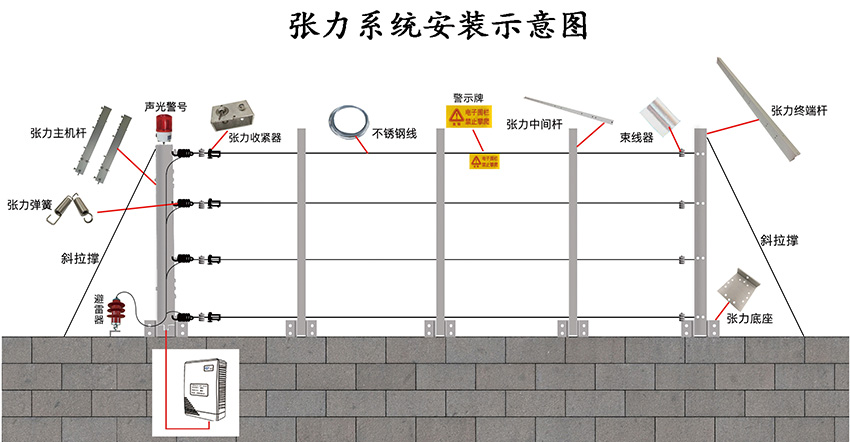 現在來說下張力電子圍欄,前面也說瞭(le)張力圍欄和脈沖圍欄最大的區别就是張力圍欄不具備有高壓脈沖電擊功能,報警和阻擋同樣具備瞭(le)。張力圍欄的報警方式是當前端的圍欄的拉力值發生瞭(le)改變就會産生報警信号。由於(yú)張力圍欄是一種物理性的報警方式 ,所以張力圍欄的每個的防區控制長度就相對較短一般在40米以内爲一個防區。由於(yú)防區控制長度較短,在同周長的項目上整體的造價成本相比脈沖圍欄要高一些。
